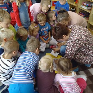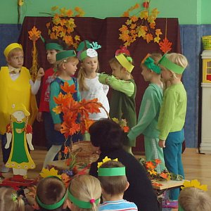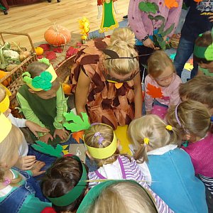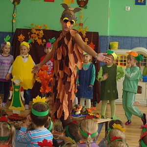 Nauczycielki Magdalena Kaczerowska oraz Marta Muszyńska zorganizowały dzieciom wiele atrakcji. Do przedszkola przybyła Pani Jesień i jej nieodłączny towarzysz Sowa Mądra Głowa. Przedszkolaki z grupy III wcieliły się w rolę warzyw i zaprezentowały teatrzyk „Na straganie” J. Brzechwy. Natomiast Zajączki zaprezentowały jesienny taniec liści. Każda grupa miała do wykonania kilka zadań. Nie obyło się bez jesiennym zagadek „Zgadnij Smyku co jesień ma w koszyku?” oraz układania w całość ilustracji porwanych przez psotny wiatr. Czas bardzo szybko i miło płynął na wspólnym tańczeniu i śpiewaniu. Na szczęście spotkamy się już za rok!