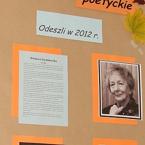 W klimat panującej za oknami pory roku wprowadziły zebranych: Anna Dembińska oraz Marta Ledzińska (trzecioklasistki), śpiewając Jesienną zadumę (sł. Magdalena Umer, Elżbieta Adamiak) przy akompaniamencie nauczyciela muzyki Andrzeja Skupniewicza. Następnie jedna uczennic przybliżyła biografię zmarłej w tym roku Wisławy Szymborskiej. A wiersz noblistki Nic dwa razy się nie zdarza, wybrzmiał podczas tego spotkania bardzo wymownie. Potem otwarto przestrzeń dla uczestników, którzy czytali utwory i snuli refleksje o: śmierci, przemijaniu, jesieni… Część osób przyniosła tomiki poezji, inni wydruki komputerowe, znalazły się także przepisane odręcznie teksty (co w XXI wieku należy do rzadkości). Pierwszą część wieczorku podsumowała piosenka Remedium (sł. Magdalena Czapińska, Seweryn Krajewski, Maryla Rodowicz), w wykonaniu w. w. uczennic.