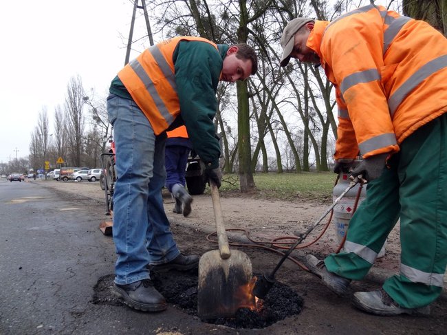 Resztki śniegu z nawierzchni dróg stopniały i drogowcy wzięli się do łatania ubytków.