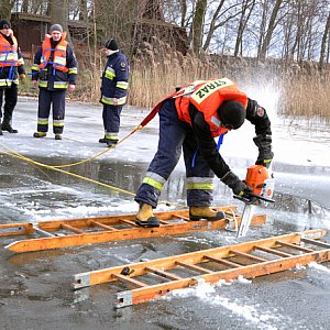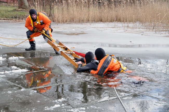 Druh Giczela, ubrany w piankę, pakuje się do wody. Najpierw on pozoruje tonącego. Na ratunek ruszają druhowie Wojciech Piotrowski (naczelnik OSP Lniano) i Tomasz Blaumann. Ubrani w niezatapialne skafandry i asekurowani linkami pewnie trzymanymi przez strażaków na brzegu. Czołgają się ostrożnie po lodzie, ciągnąc ze sobą drabinę. Ubezpieczają się w ten sposób? To też, ale po chwili okazuje się, że drabina jest potrzebna, żeby wyciągnąć tonącego na lód i bezpiecznie przejechać z nim na brzeg.