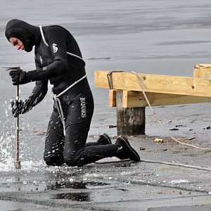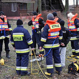 - Będziemy trenować zachowanie się podczas akcji ratowniczej na lodzie – wyjaśnia Andrzej Giczela, jeden ze strażaków. – Na szczęście nie mieliśmy jeszcze takiego wezwania, ale nigdy nic nie wiadomo. Lepiej wiedzieć jak się zachować na lodzie i jak wyciągnąć z wody człowieka, pod którym lód się załamał – dodaje. Kończy rozmowę i idzie na lód, żeby kilka metrów od pomostu wyrąbać przerębel. Uderzenia huliganem* okazują się śmiesznie bezskuteczne. Trzeba wrócić na brzeg po piłę mechaniczną i wyciąć kilka bloków lodu. Po chwili staje się jasne dlaczego tafla się nie załamała. Bloki mają po 20 cm grubości. – Teraz lód jest pewny, ale za dwa, trzy tygodnie będzie mniej bezpieczny, a wszędzie jest pełno wędkarzy łowiących pod lodem – mówi któryś ze strażaków.