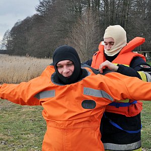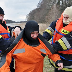 Łatwo się pisze, łatwo czyta, a wykonanie nie jest takie proste. Człowiek, który kilka-kilkanaście minut spędził w lodowatej wodzie na pewno nie ma już siły, żeby samemu położyć się na drabinie, mocno złapać i wyjechać na powierzchnię. Dlatego jeden z ratowników (na lód zawsze powinni wchodzić dwójkami) musi wskoczyć do wody, umieścić drabinę pod zdrętwiałym ciałem tonącego, położyć się na nim, chwycić drabinę i dać znak ręką – wyciągajcie. Podczas ćwiczeń koledzy żartują, ale to najskuteczniejsza metoda, a chodzi o ludzkie życie. Po kilku próbach w różnych konfiguracjach, zmiana. Skafandry, z pomocą kolegów, zakładają Mariusz Witkowski i Mikołaj Grabowski. Oni ciągną ze sobą nie drabinę, a deskę ratowniczą ortopedyczną. Jest na wyposażeniu prawie każdego wozu strażackiego, a też doskonale nadaje się do akcji ratowniczej na lodzie. Później próbowany jeszcze inny wariant – podjechanie do tonącego łódką.