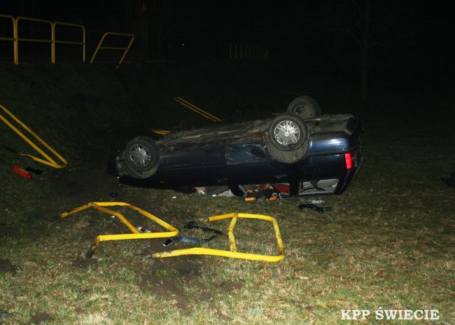 W środowy wieczór (26.03) policyjny patrol w Tleniu zatrzymywał do kontroli przejeżdżającego vw golfa. Zamiast zatrzymać się kierowca ominął funkcjonariusza, przyspieszył i zaczął uciekać. Policjanci ruszyli w pościg za nim. Uciekający z dużą prędkością kierowca na łuku drogi nie opanował pojazdu, przełamał w bariery ochronne i spadając ze skarpy dachował. - Natychmiast mundurowi przystąpili do akcji ratowniczej wyciągając mężczyznę z wraku pojazdu – informuje st. asp. Maciej Rakowicz, rzecznik prasowy KPP Świecie. - Po opatrzeniu ran przez pogotowie ratunkowe 49-letni mieszkaniec powiatu świeckiego został zatrzymany. Miał około 1,5 promila alkoholu w organizmie. Ponadto nie posiadał uprawnień do kierowania samochodem osobowym – dodaje.