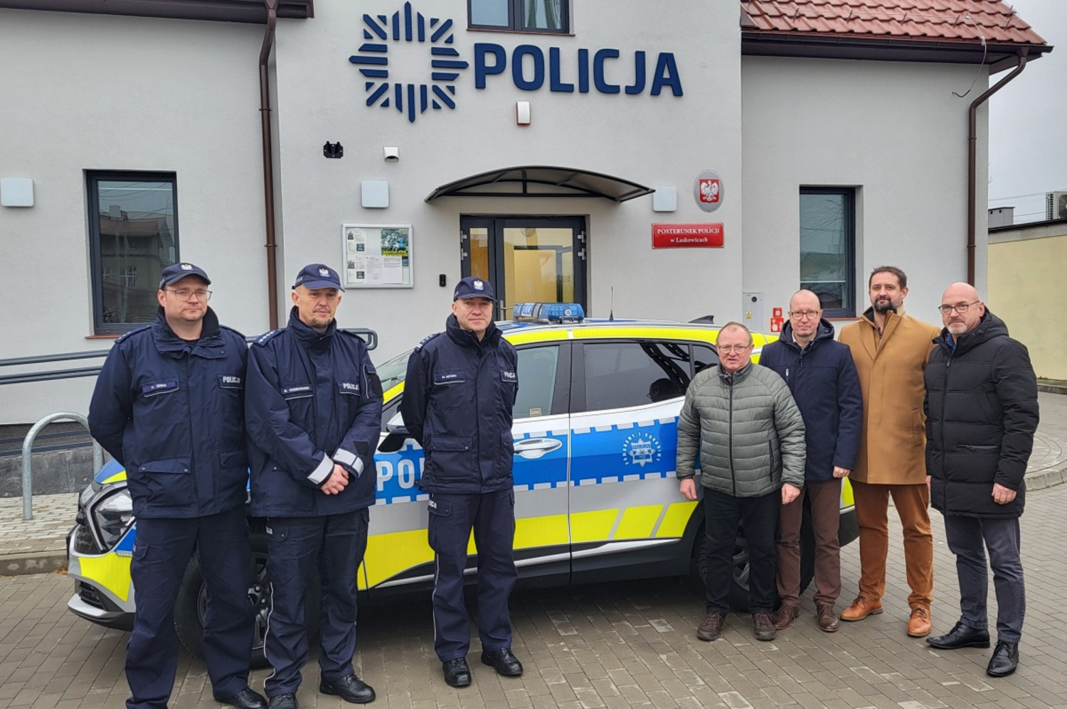 Przyjmując kluczyki do nowego radiowozu, kierownik posterunku podziękował zaproszonym gościom za współfinansowanie zakupu samochodu.