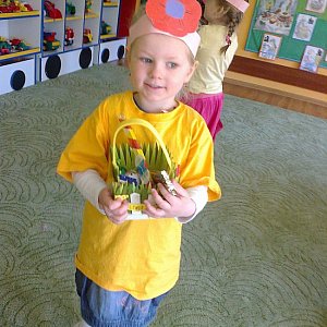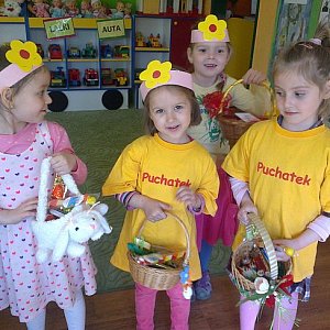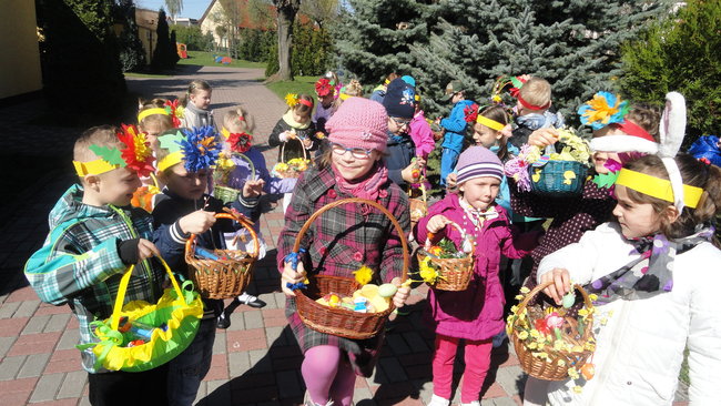 Każda grupa zaśpiewała piosenkę lub recytowała wiersz dla wyczekiwanego gościa. Zajączek niepostrzeżenie pojawił się i pozostawił koszyczki w przedszkolu i ogrodzie. Młodsze dzieci z radością szukały swoich koszyczków w salach, zaś dzieci z grup starszych wyszły na plac zabaw w poszukiwaniu swojej niespodzianki. W czasie poszukiwań było wiele radości, bo w koszyczkach znalazły dużo słodkości i zabawki.