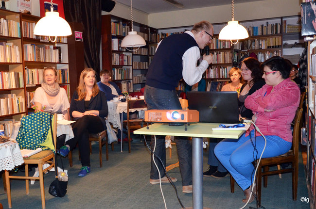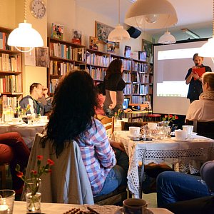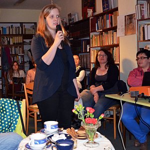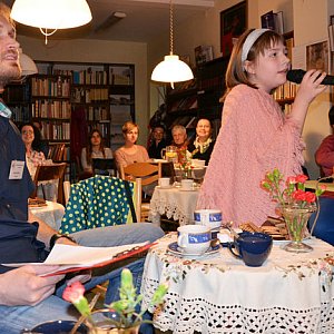 To święto wszystkich czytających obchodziliśmy naprawdę hucznie. By oddać należny szacunek książce wszystkie piosenki inspirowane były literaturą. Publiczność mogła więc usłyszeć m. in. Henryka Sienkiewicza (Dumka na dwa serca) obok Agnieszki Osieckiej (Okularnicy), Jonasza Koftę (Pamiętajcie o ogrodach) w doborowym towarzystwie Adama Mickiewicza (Niepewność), czy też Kornela Makuszyńskiego (Lato czeka) bok w bok z Marią Dąbrowską (Walc z Nocy i Dni). Takie zaskakujące, a nawet egzotyczne spotkania możliwe były tylko tego dnia u nas. Głosy chóralne i solowe, starsze i młodsze, niskie i wysokie wypełniały czytelnię, która zamieniła się w dom restauracyjny z estradą, niemal z prawdziwego zdarzenia, a wtórująca wszystkim publiczność dodawała otuchy stremowanym. Nie brakowało odważnych dźwiękowych parafraz, śmiałych arytmicznych wykonań i zupełnie autorskich nut, bo podczas naszego „literackiego karaoke” obowiązywała powszechna wolność śpiewania. Szczególną uwagę pragnę zwrócić na pewien utwór w wykonaniu ‘czterech pancernych bibliotekarzy’, który ma wszelkie dane, by być wysoko na wszystkich możliwych listach przebojów. Gwoli ścisłości, rozśpiewana publiczność świetnie bawiła się również podczas muzycznego konkursu, który nie sprawił naszym gościom najmniejszym kłopotów. Wszyscy laureaci otrzymali skromne, ale miłe upominki. Całość uwieńczył występ Ariela Stawskiego, który przygotował dla zebranych kilka nastrojowych utworów z akompaniamentem gitary akustycznej. To był naprawdę udany wieczór!