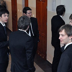 Wyposażeni w kalkulatory, podstawowe przybory do pisania i rysowania figur, elegancko ubrani i przeważnie w dobrych nastrojach. Jedni jeszcze upewniali się u kolegów co do jakiegoś wzoru, inni omawiali wczorajszy wieczór, a niektórzy starali się odstresować grając w karty. – Ćwiczymy rachunek prawdopodobieństwa – żartowali.