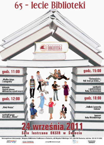 Już jutro od godziny 11.00 rozpoczną się obchody jubileuszu 65-lecia Biblioteki. Na początek wielka bitwa z ortografią, po godzinie 12.00 wystartuje spektakl "Mały książę" w wykonaniu grupy teatralnej "Słowo" ze Świecia (fotorelacja z ostatniej próby zespołu można znaleźć poniżej). O 15.00 spotkanie z Kubą Terakowskim, biologiem, podróżnikiem, współtwórcą takich czasopism jak "n.p.m" i "Rowerotur". Wieczór zwieńczy koncert Kuby Michalskiego, który wykona piosenki Leonarda Cohena - rozpocznie się o 18.00.