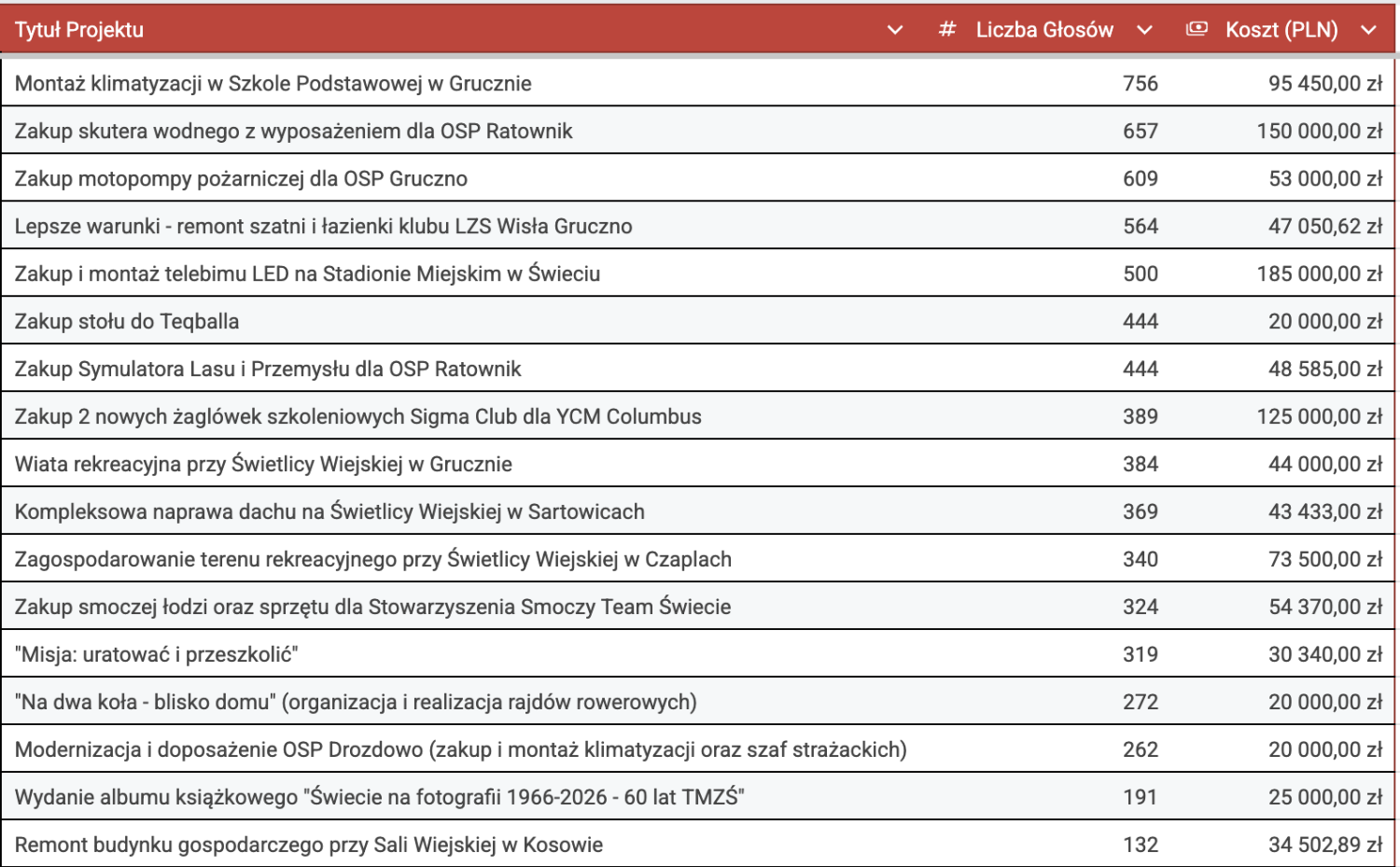Znamy już oficjalne wyniki głosowania w Budżecie Obywatelskim Gminy Świecie na 2026 rok! Mieszkańcy aktywnie wzięli udział w głosowaniu, decydując o tym, na co zostanie wydana część publicznych pieniędzy. Zgodnie z wolą głosujących, w przyszłym roku zrealizowanych zostanie szereg inicjatyw, w większości skupionych na bezpieczeństwie, sporcie i poprawie infrastruktury lokalnej.