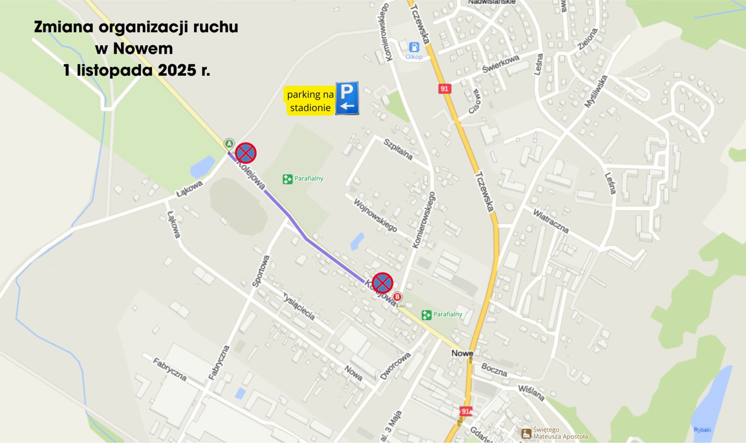 2. W Nowem 1 listopada zostaną wprowadzone zmiany organizacji ruchu. Na ul. Kolejowej (od skrzyżowania ul. Gen. Komierowskiego do skrzyżowania z ul. Łąkową) zostanie wprowadzony zakaz zatrzymywania (znak B-36). Ponadto na terenie pobliskiego stadionu zorganizowane zostaną dodatkowe miejsca parkingowe.