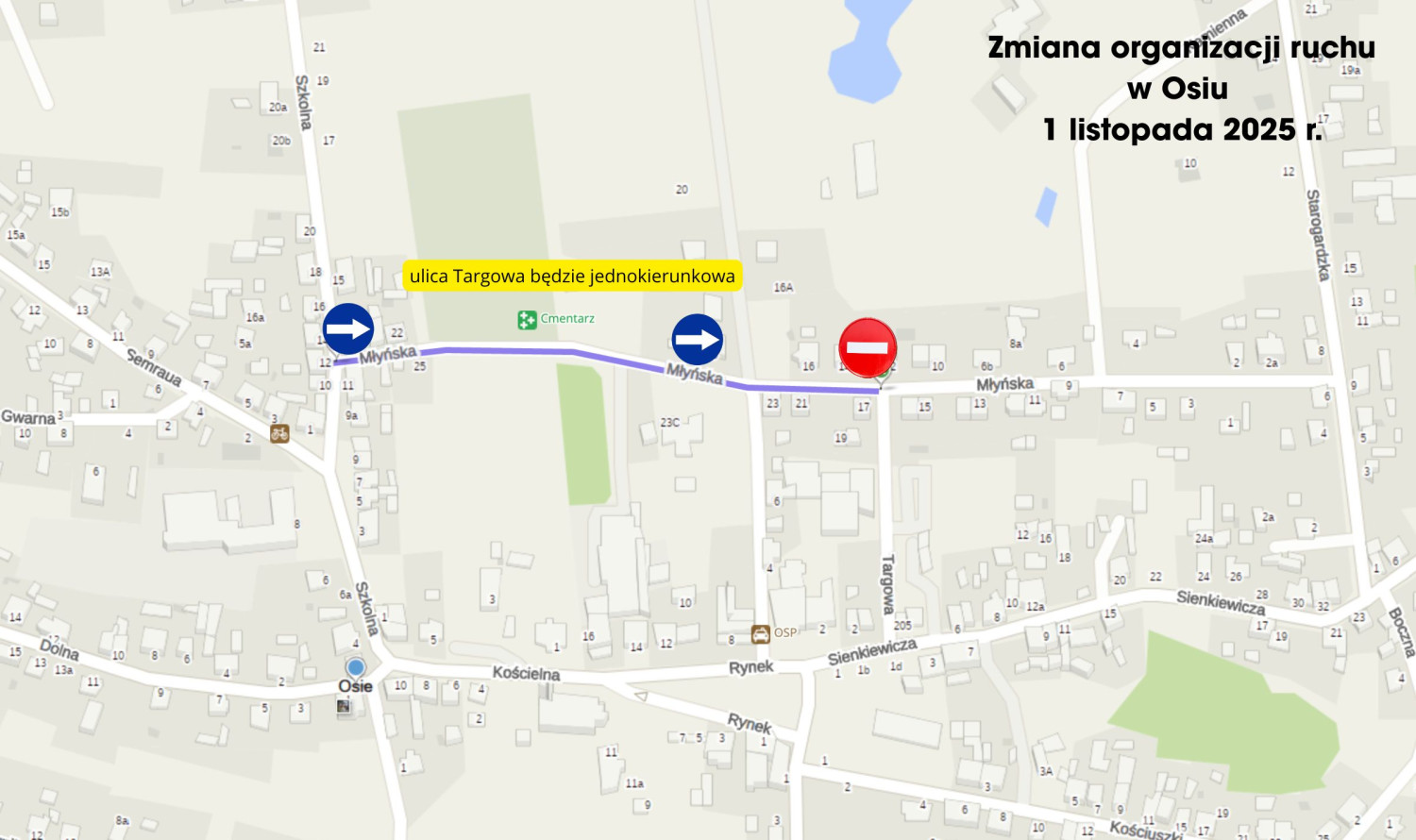 1. Przy cmentarzu parafialnym w Osiu zmiany organizacji ruchu zostaną wprowadzone wyłącznie 1 listopada. Na ul. Młyńskiej (na odcinku od skrzyżowania z ul. Szkolną do skrzyżowania z ul. Targową) będzie obowiązywał ruch jednokierunkowy z zakazem wjazdu od strony ul. Targowej.