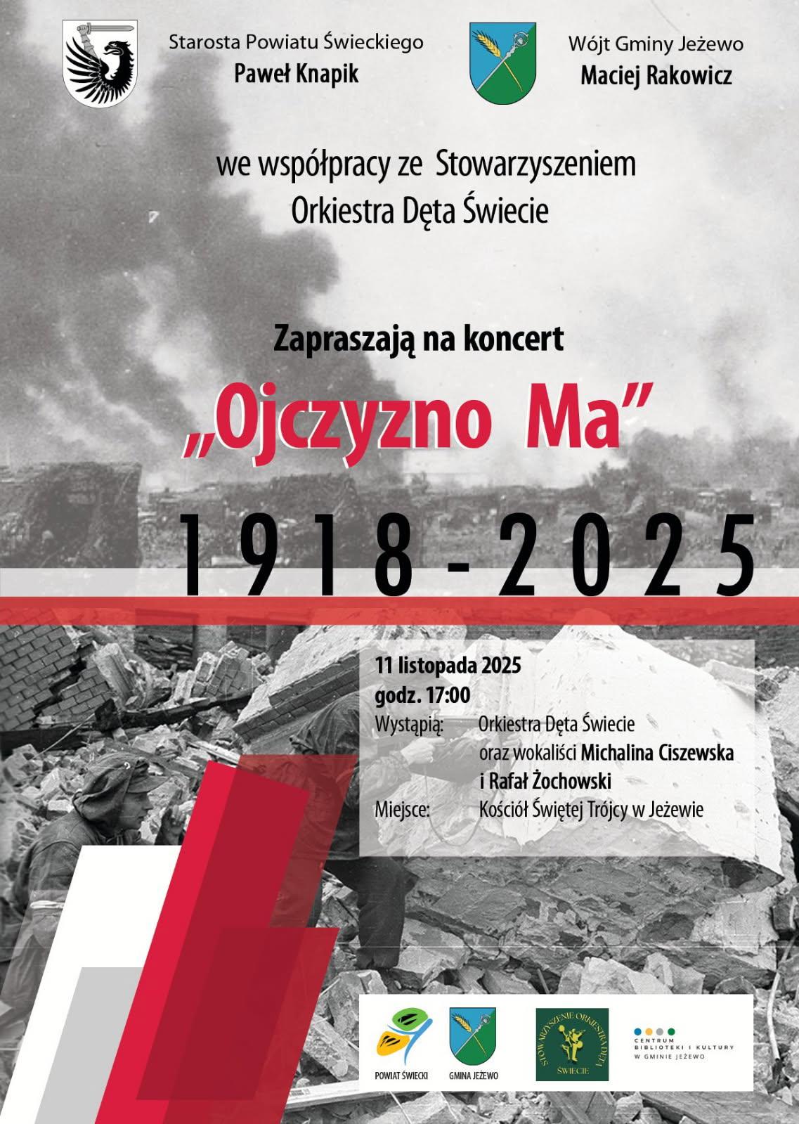 Po południu zapraszamy na muzyczny hołd dla Ojczyzny do Jeżewa. O godz. 17 w Kościele Trójcy Świętej w Jeżewie zagra Stowarzyszenie Orkiestra Dęta Świecie, a zaśpiewają Michalina Ciszewska i Rafał Żochowski.