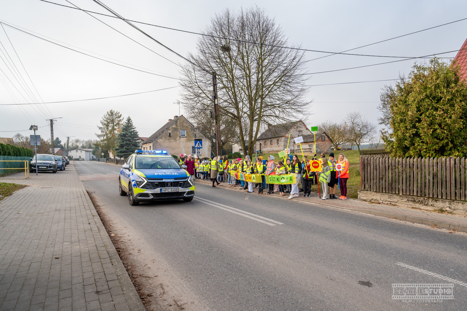 Marsz, zabezpieczony przez funkcjonariusza Policji, przebiegł w atmosferze wspólnej odpowiedzialności, pokazując lokalnej społeczności, jak ważny jest nawyk noszenia nawet najmniejszego odblasku.