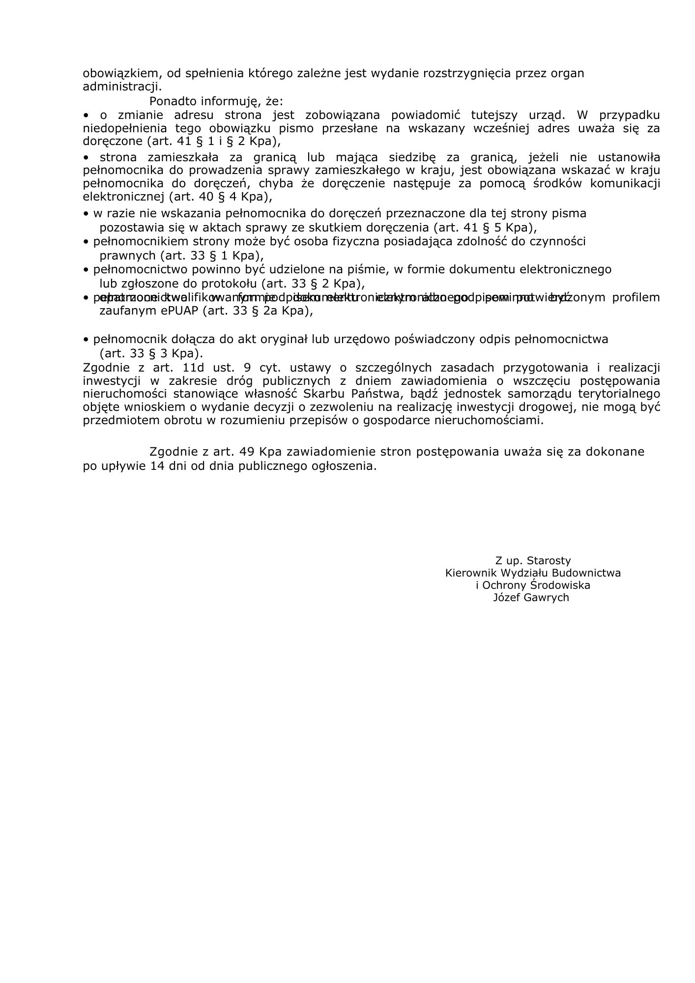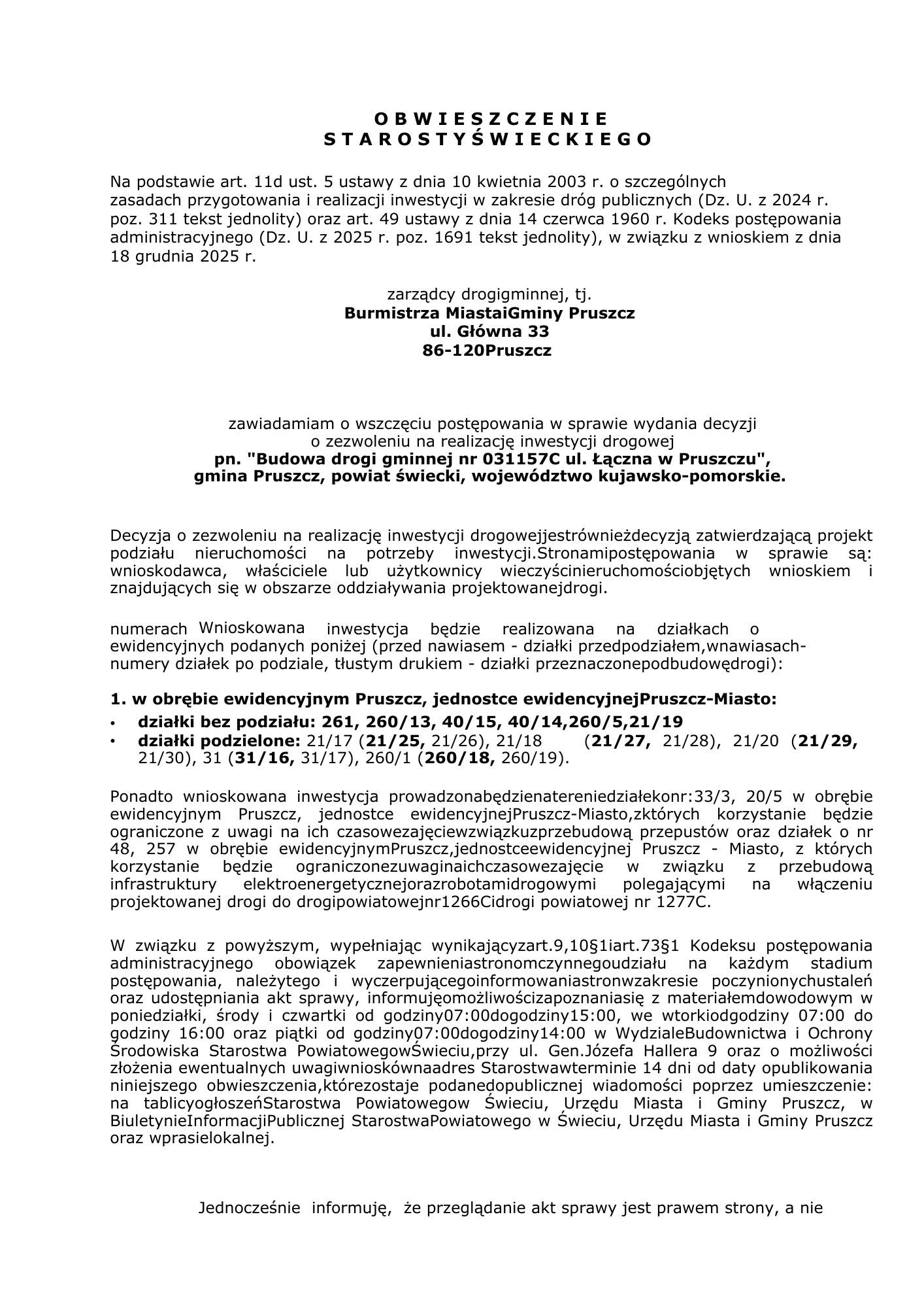 Obwieszczenie Starosty Świeckiego - budowa ulicy Łącznej w Pruszczu