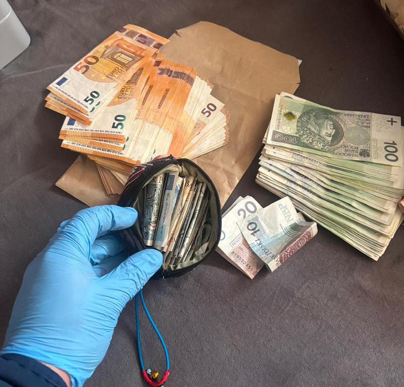 Przy 44-latku znaleziono blisko 34,5 tys. złotych, 6,4 tys. euro oraz inne waluty obce.