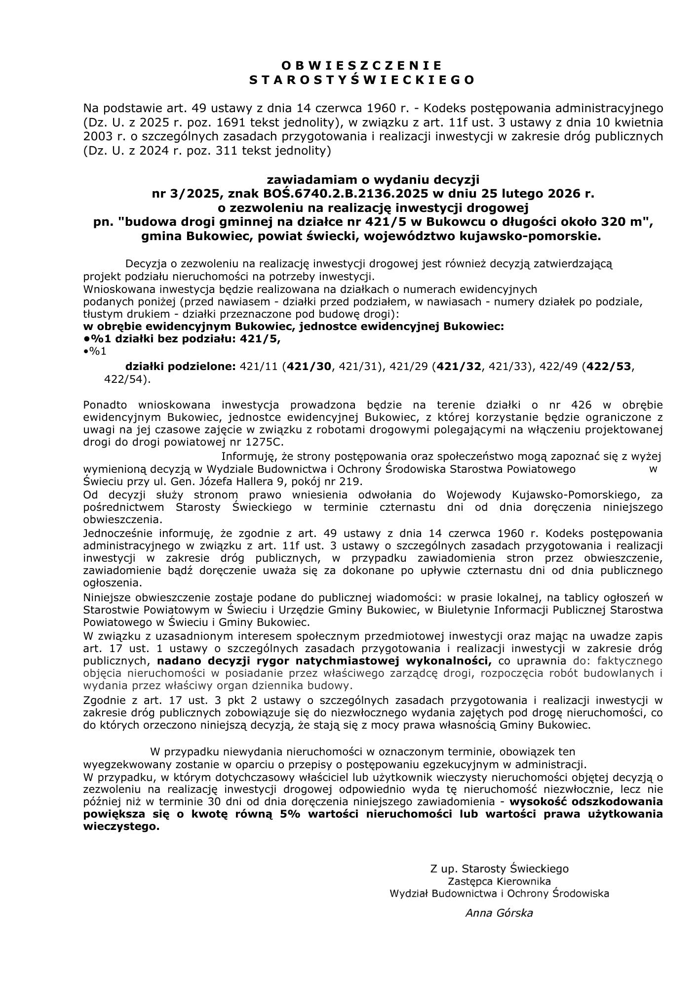 Obwieszczenie Starosty - budowa drogi w Bukowcu