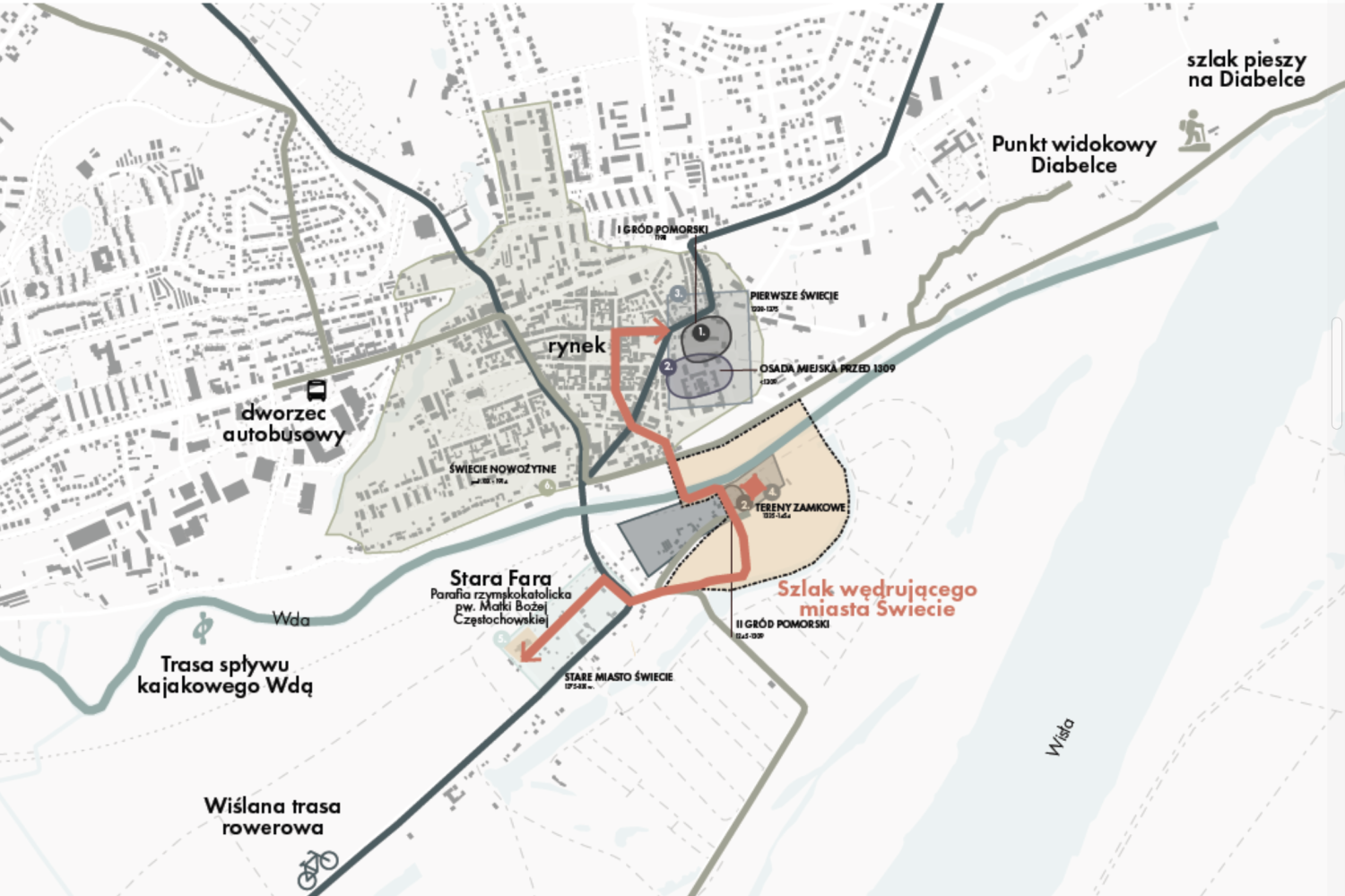Plan wskazuje na potrzebę zmiany logiki patrzenia: zamek nie jako osobna atrakcja, ale jako centralny punkt krajobrazu społecznego, kulturalnego i przyrodniczego. Potencjał turystyczny opiera się na umiejętności opowiedzenia historii miejsca – historii, w której natura, człowiek i kultura współistnieją. Świecie dąży do poszerzenia swojej struktury o przemysły czasu wolnego i turystyki jakościowej. Społecznie: chce odzyskać zaniedbane przestrzenie i przekształcić je w oś integracji lokalnej, którą programowo spinać będzie Centrum Kultury w Świeciu jako operator działań edukacyjnych, kulturalnych i społecznych.