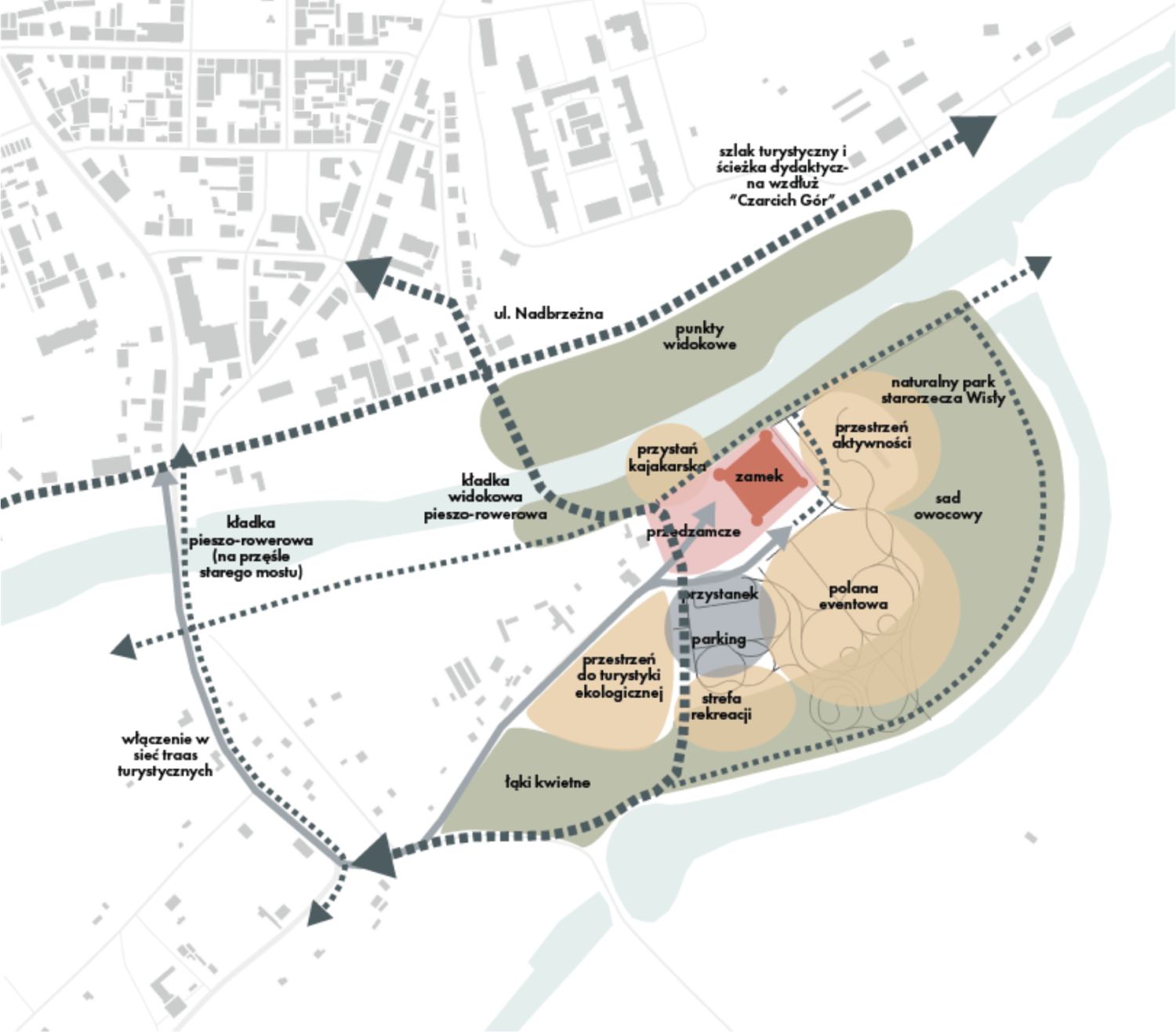 — Czarcie Góry nie znalazły się na marginesie. W strategii zostały włączone jako część większej narracji: dolina Wisły jako oś ekologiczna i kulturowa. To nie są tylko „tereny zielone” – to żywe zaplecze miasta. Plan zakłada powiązanie terenów zamkowych (zakres opracowania) z obszarem zarządzanym przez Zespół Parków Krajobrazowych nad Dolną Wisłą. Połączenia te mają charakter nie tylko funkcjonalny – poprzez system ścieżek, tras rowerowych oraz powiązań z terenami rekreacyjnymi doliny Wisły – lecz także operacyjny. Oznacza to możliwość współpracy przy programach edukacji przyrodniczej, interpretacji krajobrazu, działaniach na rzecz bioróżnorodności oraz wspólnym rozwijaniu oferty turystyki przyrodniczej.