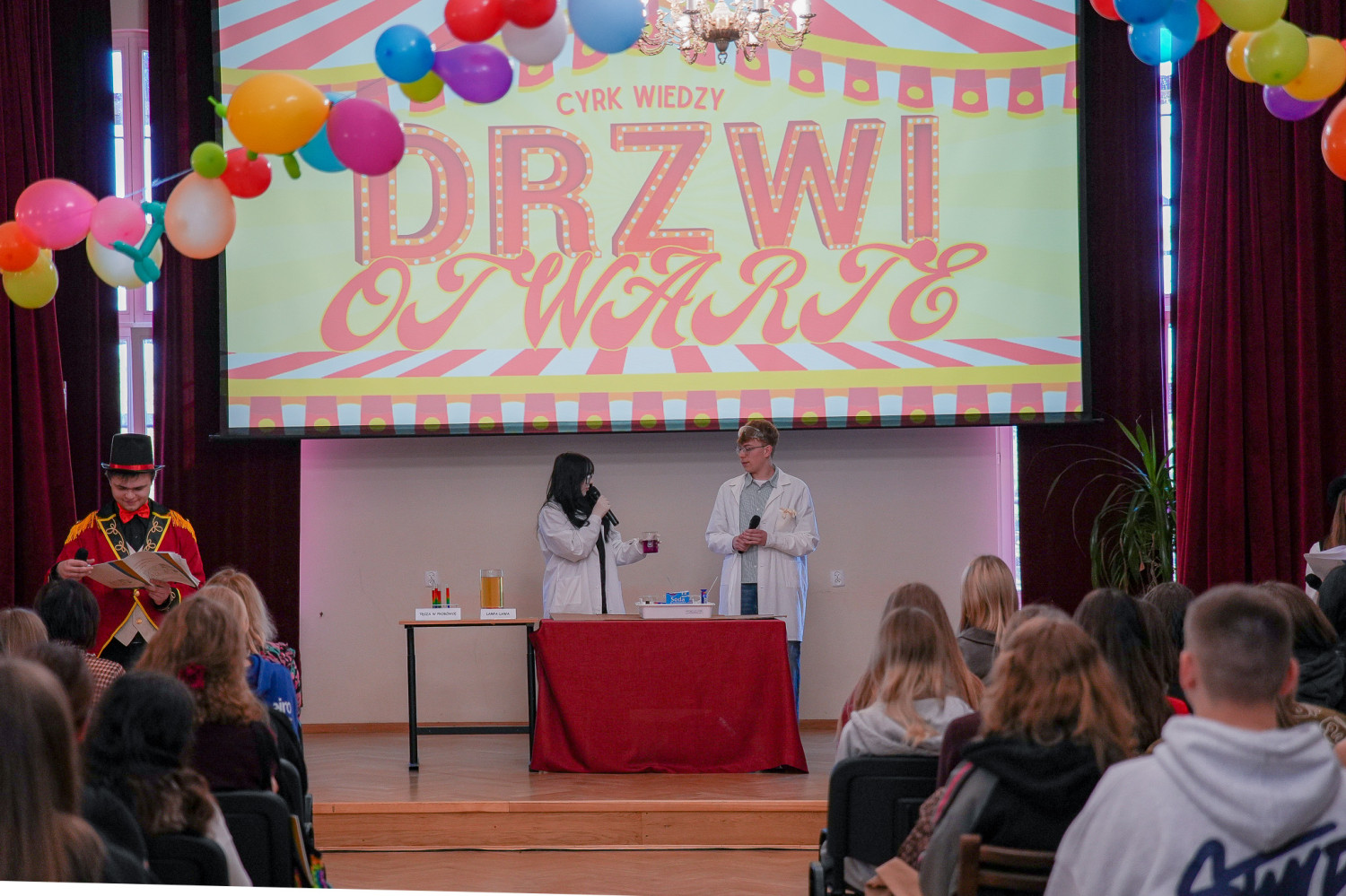 Wydarzenie rozpoczęło się od mocnego uderzenia – prezentacji szkoły w formie przedstawienia. Zamiast nudnych wykładów, kandydaci mogli zobaczyć licealne życie w pigułce, podane z przymrużeniem oka, w formie cyrku.
