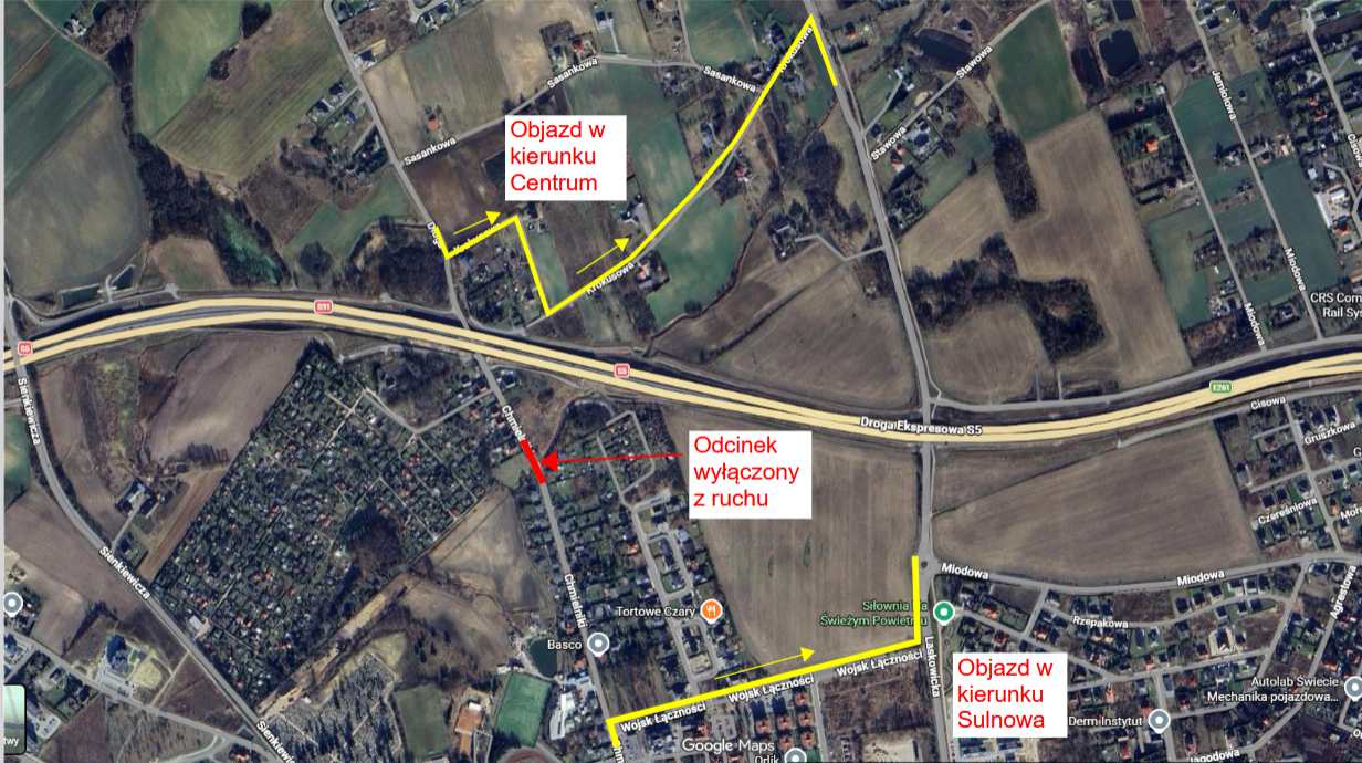 W związku z zamknięciem odcinka drogi, wyznaczone zostały specjalne objazdy. Ich szczegółowy przebieg można znaleźć na poniższej mapie. Drogowcy apelują o uważne śledzenie oznakowania pionowego, które zostało zaktualizowane na potrzeby zbliżającego się remontu.