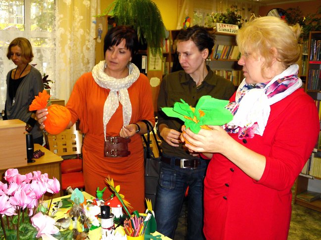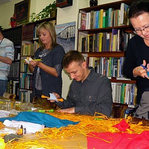 Tematem przewodnim była oferta bibliotek dla dzieci – „Baw się z nami”. Idąc tym tropem zapewniliśmy naszym gościom świetną zabawę. Zaczęliśmy od amatorskiego teatru dzieci i młodzieży, zaprzyjaźnionego z Biblioteką. Wystąpili oni w przedstawieniu zatytułowanym „Książka przed sądem”, a przygotowała ich do tego, zresztą świetnie, Katarzyna Krzemińska – pracownik oddziału dla dzieci MBP. Po wyroku, który nie mógł być inny: „Książka nigdy nie przejdzie do lamusa”, pracownicy oddziałów i filii dla dzieci, jak również nasi goście z bibliotek partnerskich, podzielili się informacjami, jakie jeszcze ciekawe oferty mają dla młodego pokolenia. Na koniec wspólnie wykonaliśmy kukiełki z rafii, przyoblekając je w kolorowe stroje, co sprawiło nam wiele radości.
