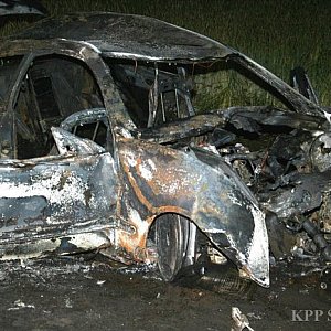 Pędzący samochód wyleciał z drogi, roztrzaskał się o drzewo, przeleciał nad szosą i stanął w płomieniach.