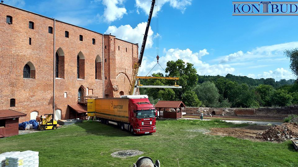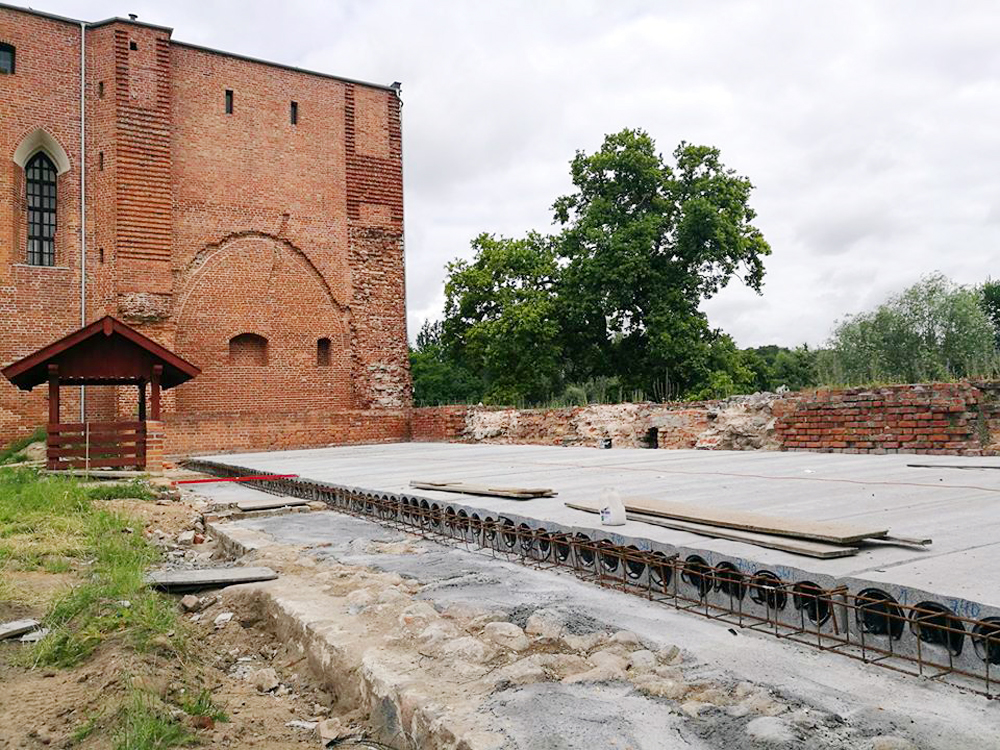 Roboty remontowe przebiegają zgodnie z przyjętym harmonogramem. Niedawno ułożono płyty sprężone kanałowe nad sklepieniem piwnicy wschodniej. Dzięki temu, że opierają się na ścianach piwnicy, ciężar nie jest przenoszony na sklepienia. Ostatnim elementem, który trzeba jeszcze wykonać w tej części jest zaizolowanie płyt przed wodą, aby ta nie mogła już dostawać się do piwnicy.