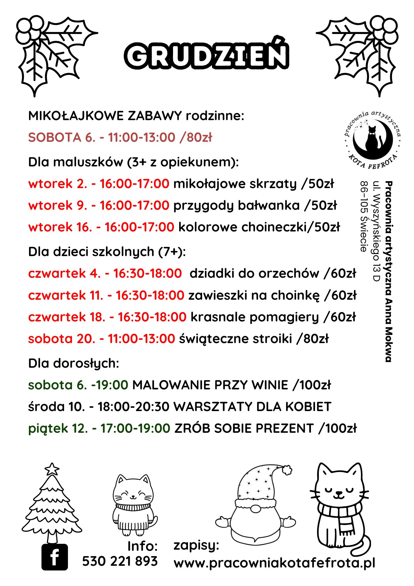 Pracownia Kota Fefrota nie zapomina o dorosłych, a w szczególności o kobietach szukających chwil wytchnienia. W ofercie znajdują się kameralne warsztaty rozwojowe i rękodzielnicze. To idealna okazja, by zwolnić tempo, wyciszyć się i w przyjaznym, babskim gronie stworzyć coś pięknego. To czas na odpoczynek od codziennych obowiązków i naładowanie baterii pozytywną energią.