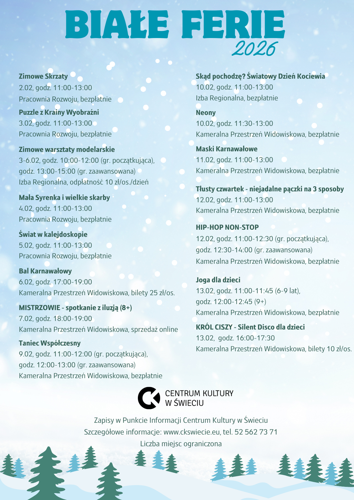 Na zajęcia obowiązują zapisy w Punkcie Informacji Centrum Kultury (ul. Wojska Polskiego 139) od poniedziałku do piątku w godz. 09:00-18:00. Pamiętajcie, że warunkiem uczestnictwa jest podpisanie oświadczenia przez opiekuna.