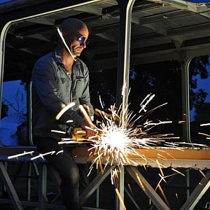 Namiot-stocznia zbudowany więc można przystąpić do budowy arki. Tylko tu, dźwiękom szlifierki kątowej i błyskom spawarki towarzyszy muzyka na żywo. FILM