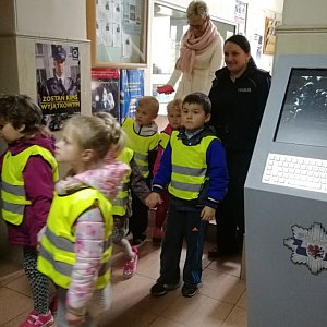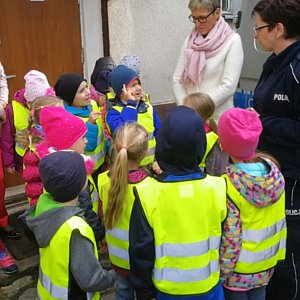 Wycieczka zakończyła się spotkaniem dzieci z mundurowymi na sali, gdzie odbywają się odprawy służbowe policjantów. Jeszcze raz powtórzono najważniejsze zasady bezpieczeństwa. Mł. asp. Julia Świerczyńska oraz st. sierż. Paulina Kufel podkreśliły jak ważne są elementy odblaskowe, które dzieci mają na sobie i wyjaśniły zasadę ich działania za pomocą specjalnej tuby.
