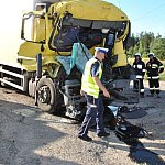 Kierujący samochodem ciężarowym uderzył w tył naczepy innej ciężarówki. Niewiele brakowało żeby ciężarówka wbiła się w środek domu mieszkalnego. Jedna osoba poważnie ranna.