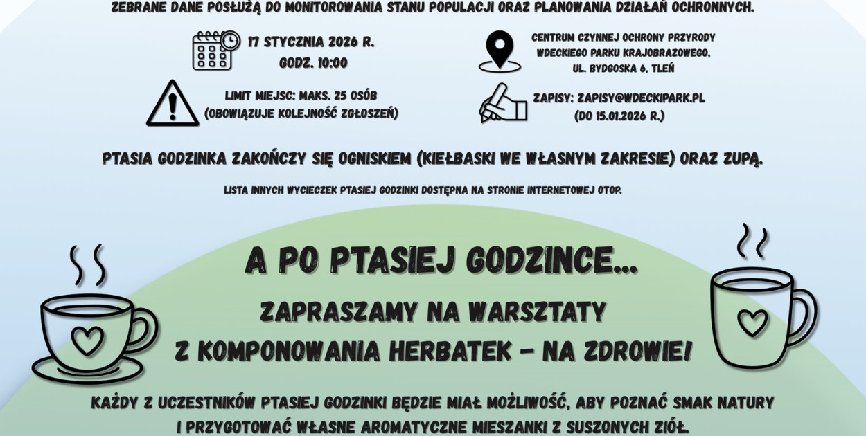 Zapraszamy w sobotę, 17 stycznia 2026 r., godz. 10:00 w Centrum Czynnej Ochrony Przyrody Wdeckiego Parku Krajobrazowego, ul. Bydgoska 6, Tleń.