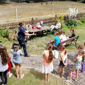 Na obozie konnym w Krąplewicach wypoczywają dzieci z powiatu świeckiego. Mł. asp. Julia Świerczyńska wspólnie z Angeliką Ejankowską-Makuch zorganizowały dla obozowiczów wakacyjne spotkanie. Tematem wiodącym było bezpieczeństwo na drodze, w domu, na placu zabaw, podczas kąpieli oraz w lesie. Mundurowe radziły dzieciom, jak reagować w sytuacjach zagrożenia oraz do kogo zwrócić się o pomoc, szczególnie w kontaktach z osobami obcymi. Tego typu spotkania mają służyć temu, aby dzieci wiedziały jak bezpiecznie się bawić, a zarazem bezpiecznie wypoczywać podczas wakacji.