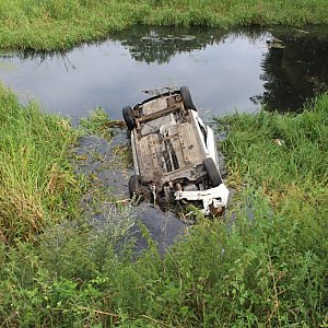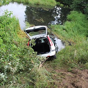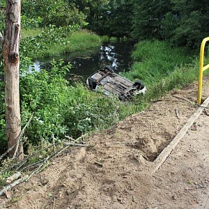 Do niebezpiecznego zdarzenia doszło dziś (30.07.2018) o godz. 7.49. Na łuku drogi samochód zjechał z szosy, dachował i wpadł do rzeki Prusiny. Na szczęście w tym miejscu woda jest płytka, więc auto leżało na dachu i nie było zagrożenia utonięciem.