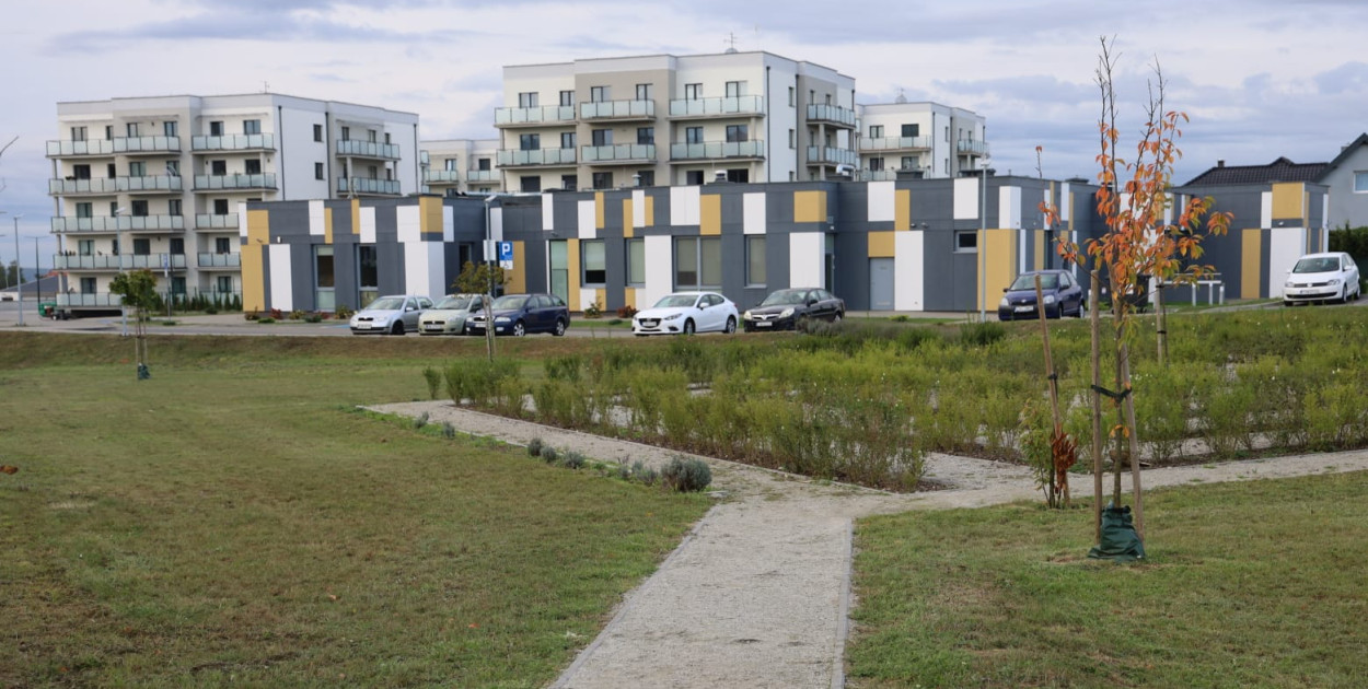 Zagospodarowany zostanie również teren wokół obiektu: powstaną dojazdy, chodniki, miejsca postojowe dla samochodów oraz tereny zielone - trawniki.