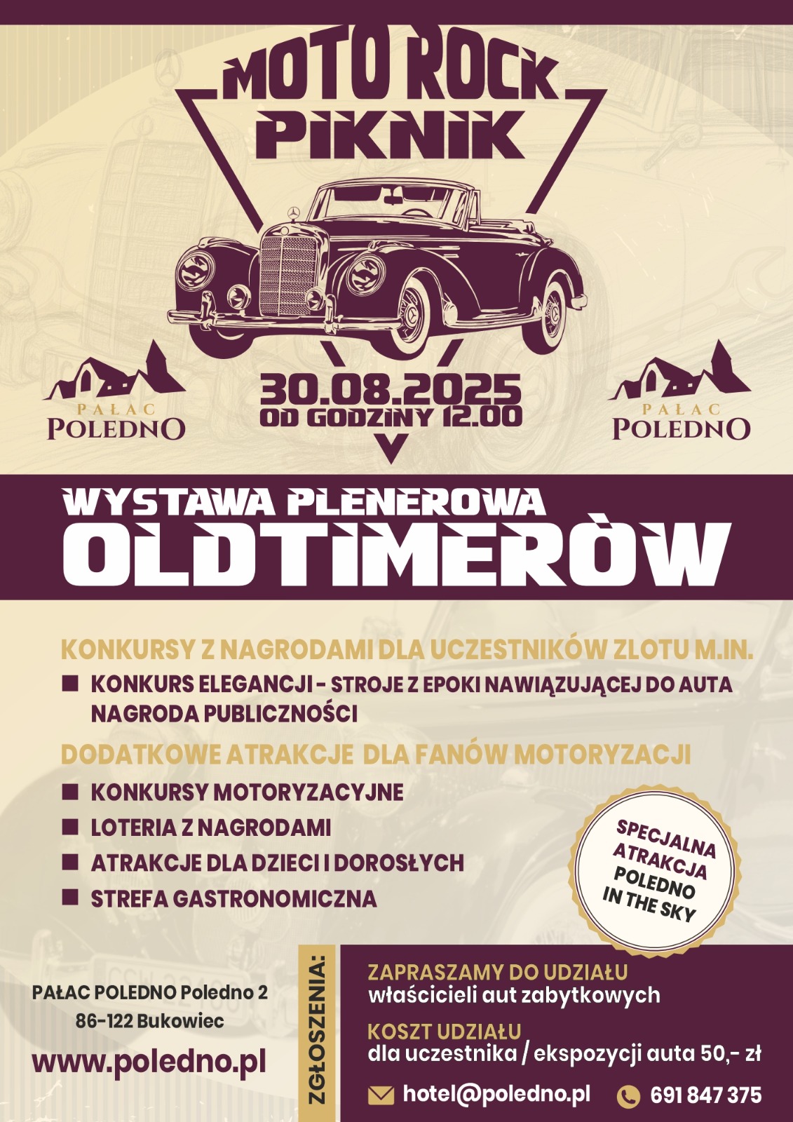 Pałac Poledno zaprasza na Moto Rock Piknik, połączony z wystawą unikatowych samochodów. To szansa, by zobaczyć i poznać historię blisko 40 niezwykłych oldtimerów z Wystawy Zabytkowych Aut w Polednie.