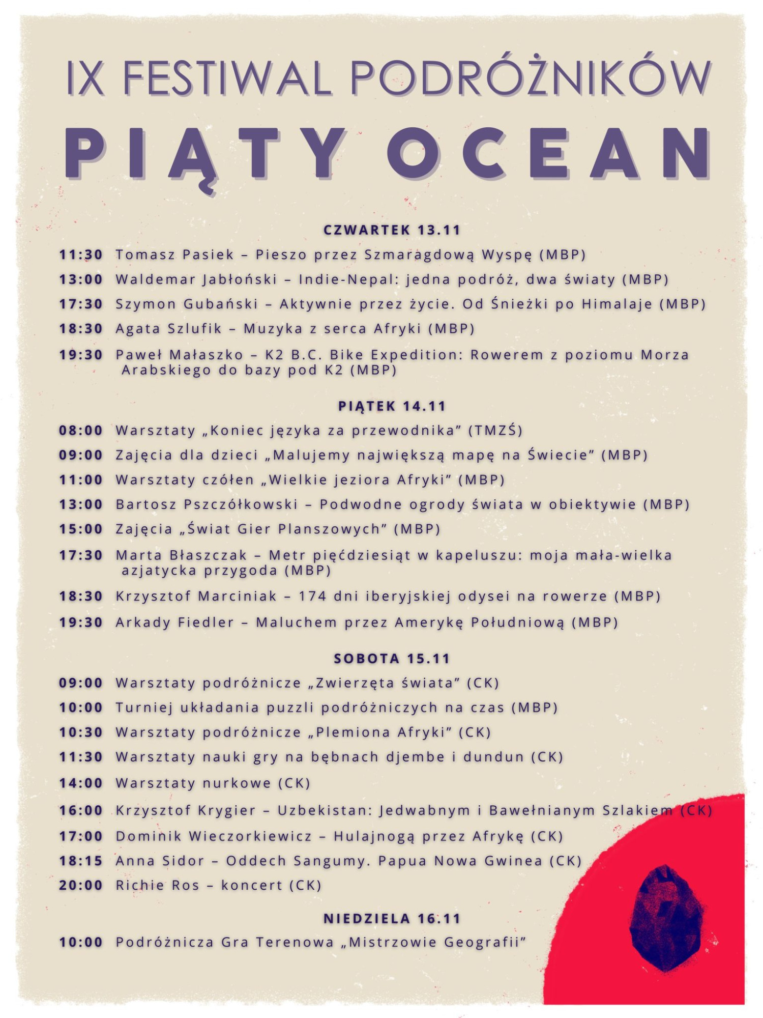 Festiwal Podróżników Piąty Ocean niezmiennie organizowany jest przez Towarzystwo Miłośników Ziemi Świeckiej. Wydarzenie potrwa od czwartku do niedzieli (13-16.11.2025). Poniżej opis tego, co organizatorzy przygotowali na tegoroczną edycję oraz godzinny program Festiwalu.