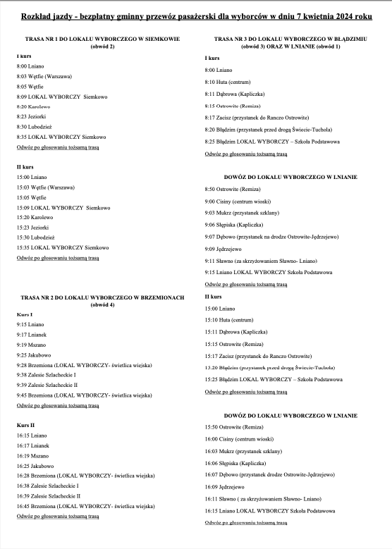 Wychodząc naprzeciw mieszkańcom gmina Lniano uruchomiła na dzień samorządowych wyborów 7 kwietnia 2024 r. bezpłatną gminną komunikację, z której mogą skorzystać wszyscy.