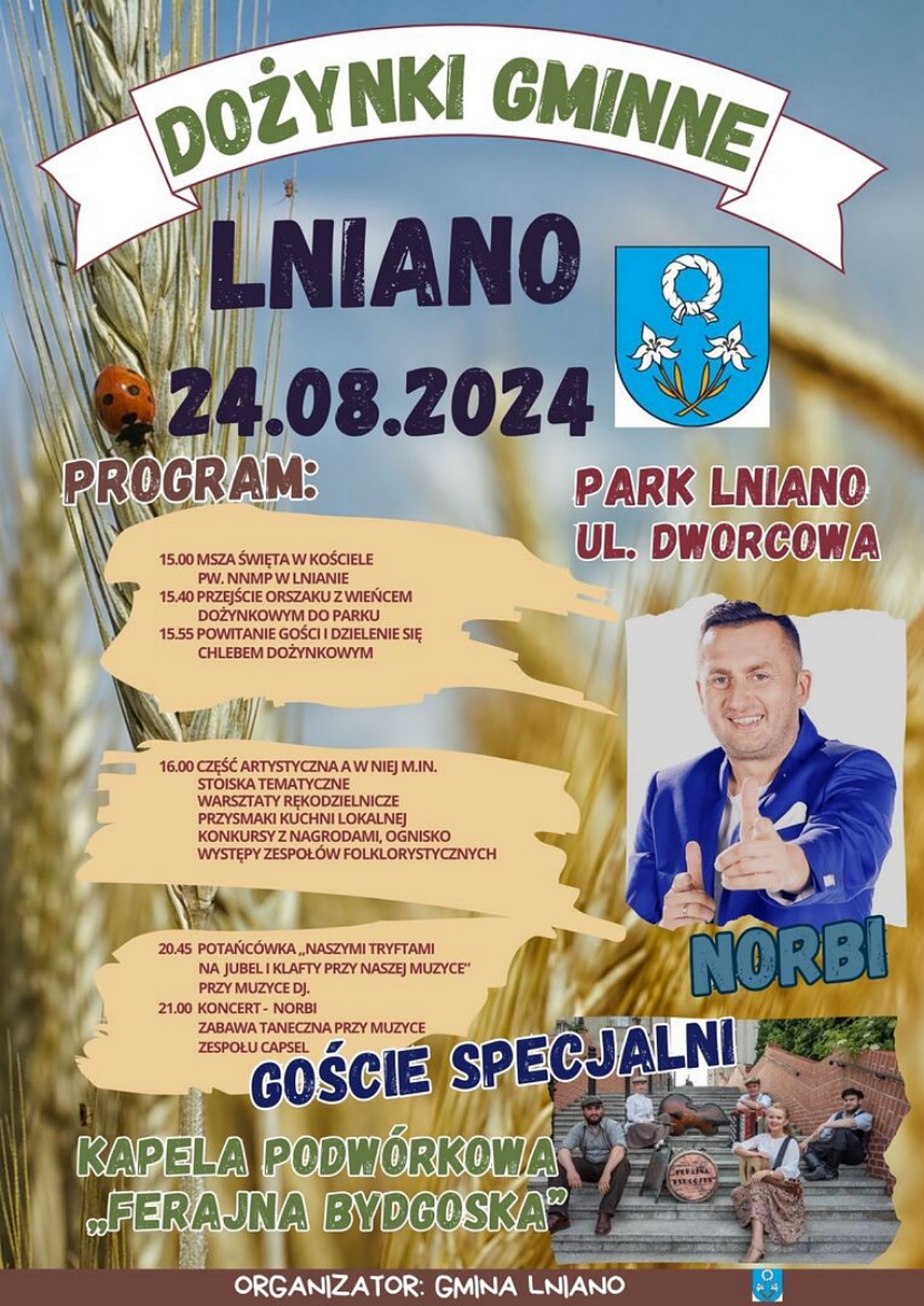 Zapraszamy na dożynki gminne w Lnianie. Uroczystości rozpoczną się o godz. 15 od mszy św. w Kościele p.w. NNMP w Lnianie. Później barwny korowód dożynkowy przejdzie do parku w Lnianie, gdzie wszyscy mieszkańcy zostaną poczęstowani chlebem, zrobionym z mąki z tegorocznych zbóż.